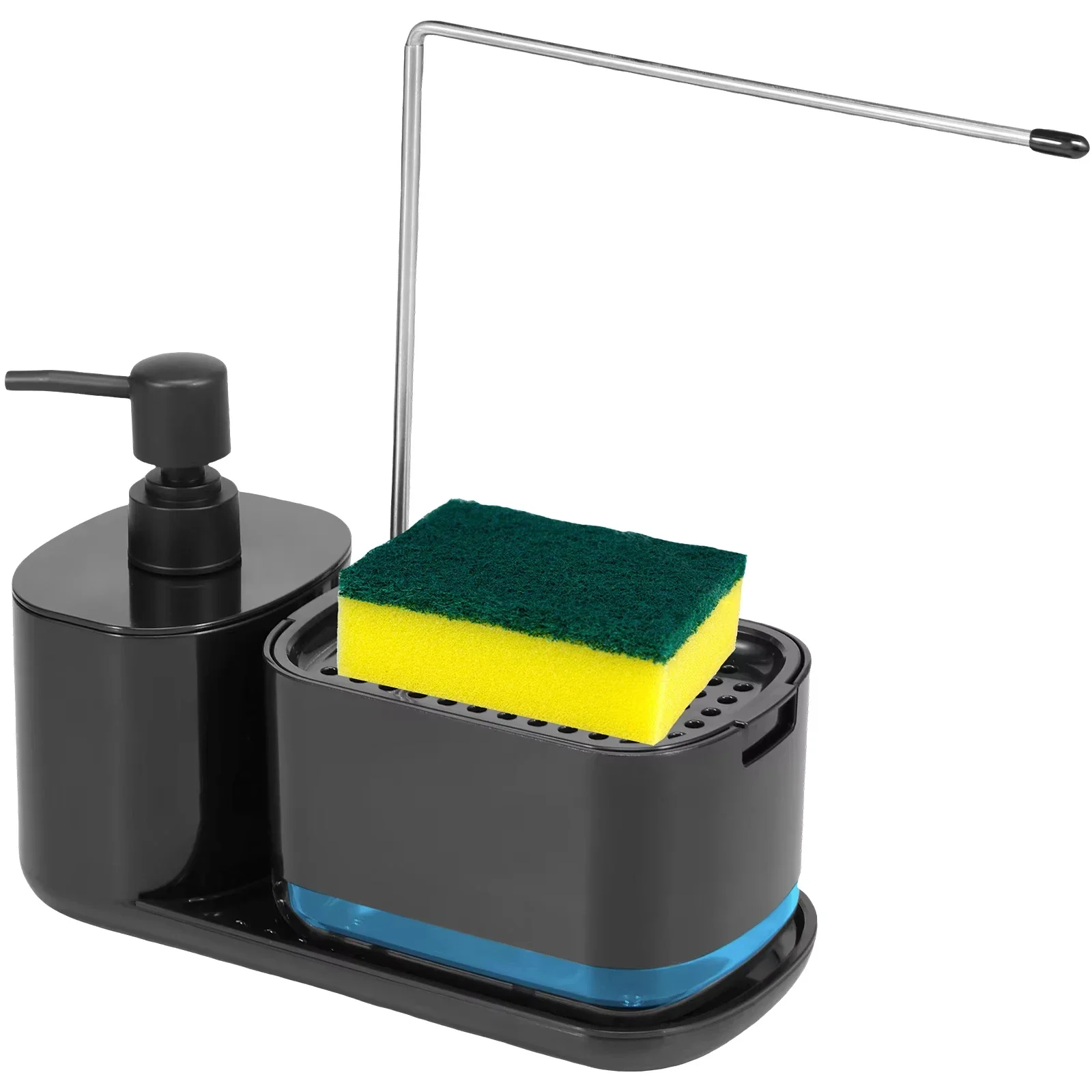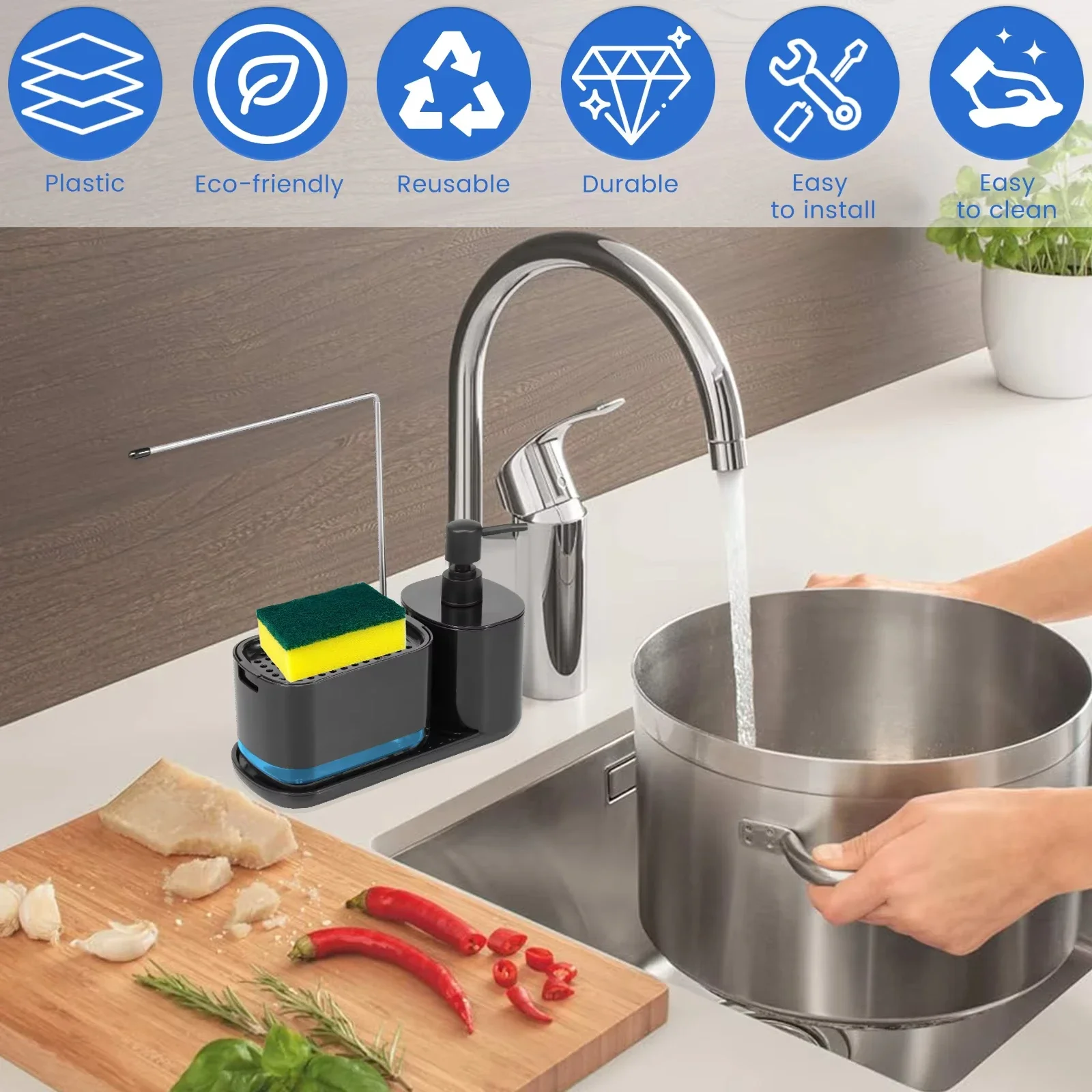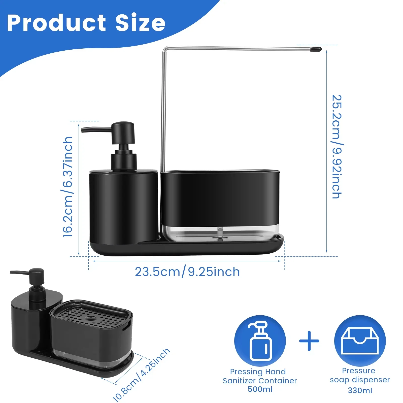 Press Dish Soap Dispenser Set Container with Sponge Holder Countertop Towel Rack Soap Pump Dispenser for Kitchen Sink Drain Tray